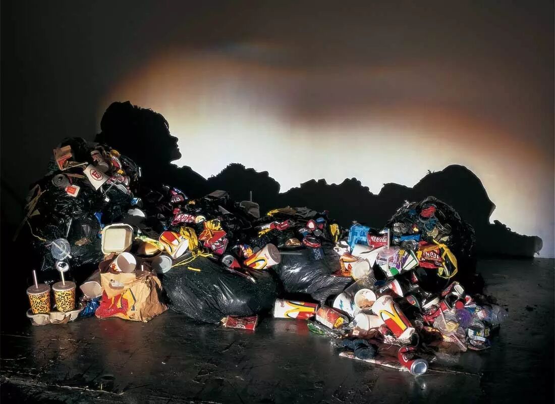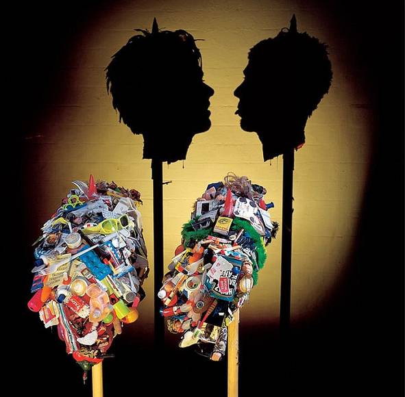 英國藝術(shù)家雙人組Tim Noble和Sue Webster,將廢木頭、廢金屬、生活垃圾、動(dòng)物標本等垃圾堆積造型后打光,做出影子雕塑……