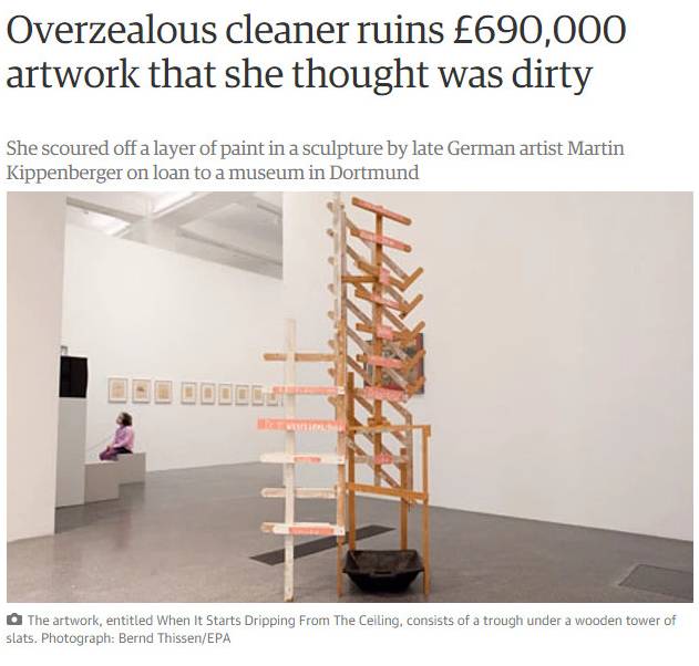 結果……盡職的清潔工覺(jué)得底下黑盆里的白色粉末太臟了,于是直接把那一層都擦掉了…..擦掉了……然而,這些臟東西可是上了69萬(wàn)英鎊的保險啊。