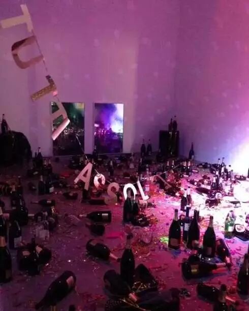 首先來(lái)看1號受害者的作品,來(lái)自意大利的藝術(shù)家妹紙組合Goldschmied & Chiari,造了這么一件藝術(shù)品并取名叫作:Where Are We Going to Dance Tonight,大概就是“咱們今晚上哪high舞到天亮?”的意思,表現出1980年代意大利那種紙醉金迷享樂(lè )主義,奢侈放蕩的生活方式……也就是宿醉嗨爆的現場(chǎng)景象。